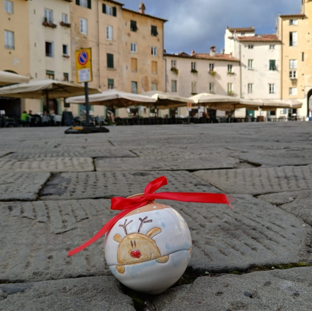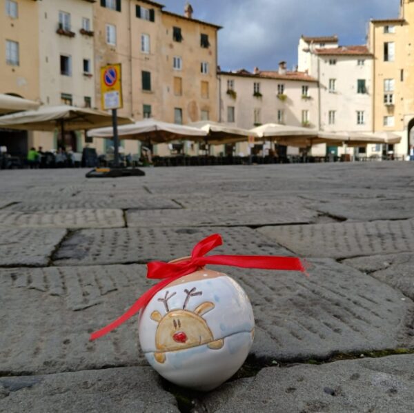Rudolph la renna dal naso rosso interpretata dalle nostre decoratrici su pallina in ceramica!