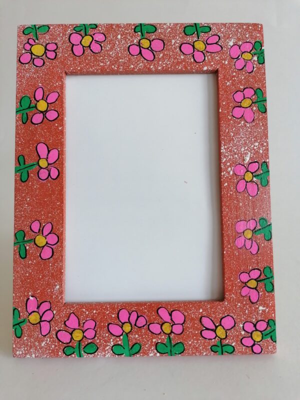 Bellissimo portafoto in legno di colore rosso mattone con decorazioni realizzate interamente dai nostri ragazzi.